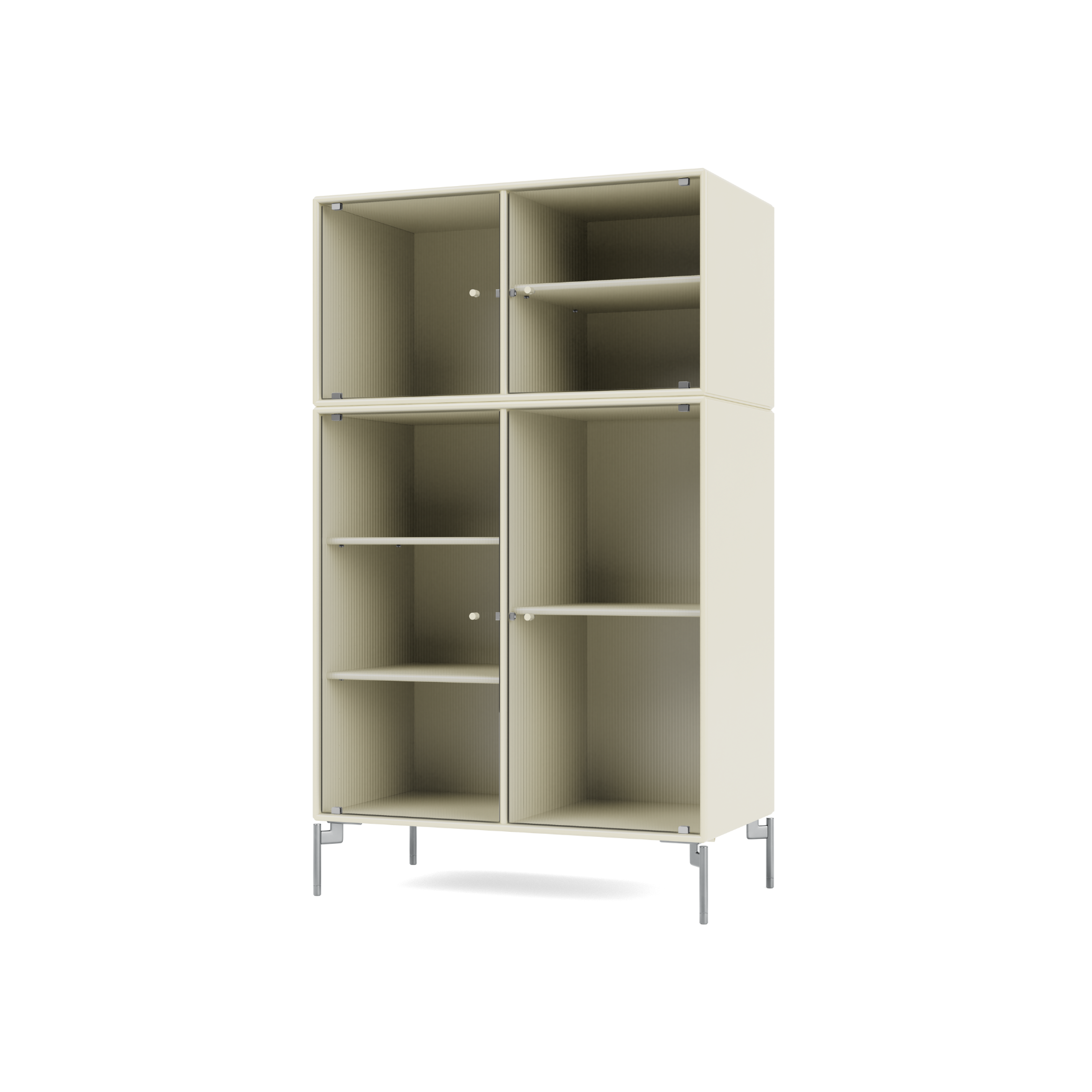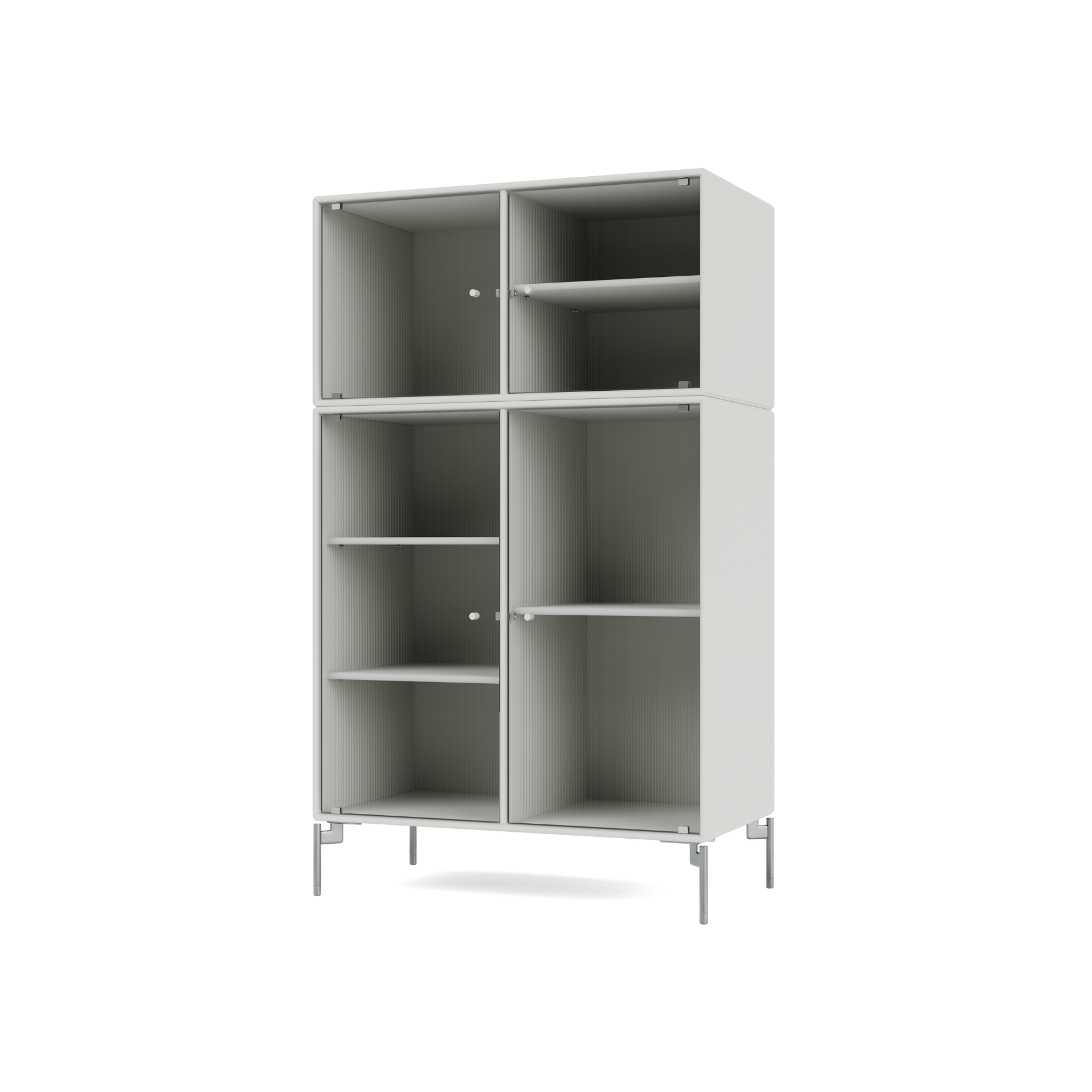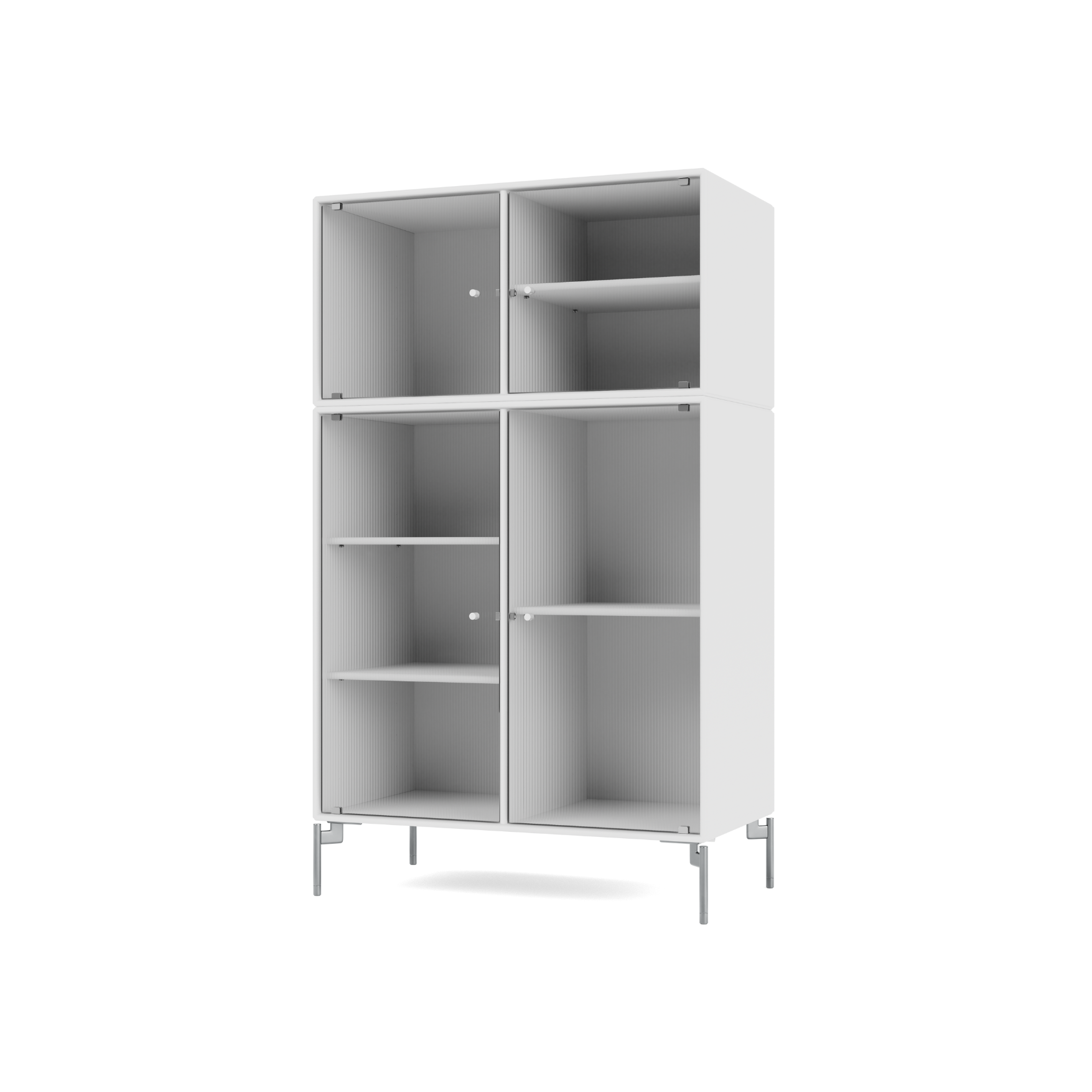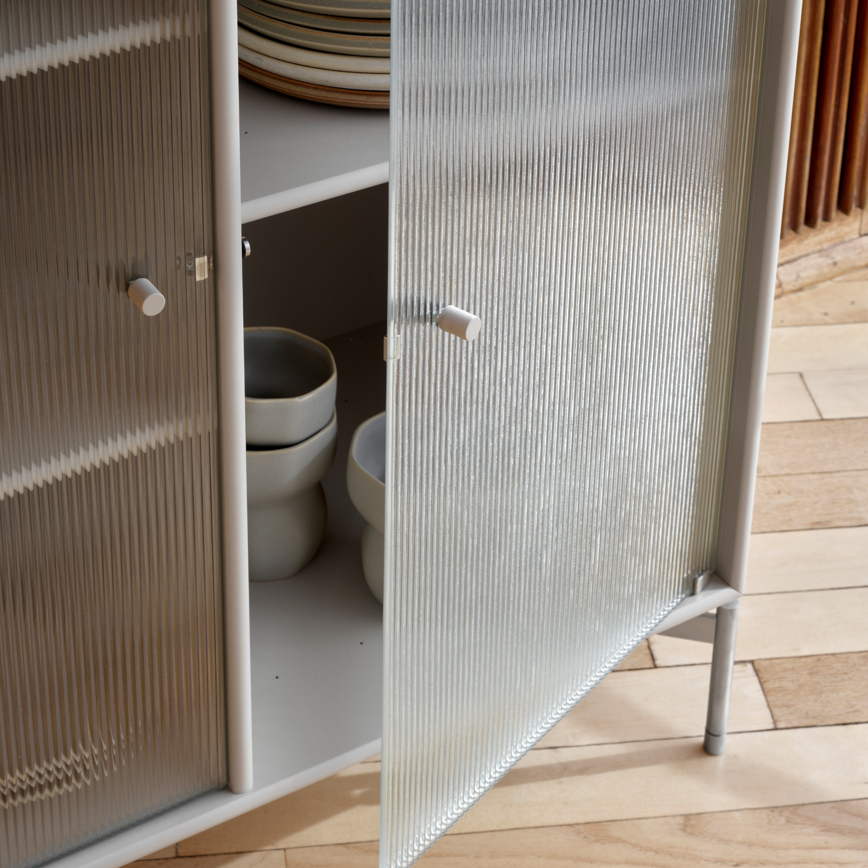 RIPPLE III is a medium-sized vitrine with 4 doors in rippled glass. The cabinet can be used as a highboard in the living room or for displaying tableware in the kitchen or dining area. The top of the cabinet is an ideal display surface for lamps, vases, and other decorative items.