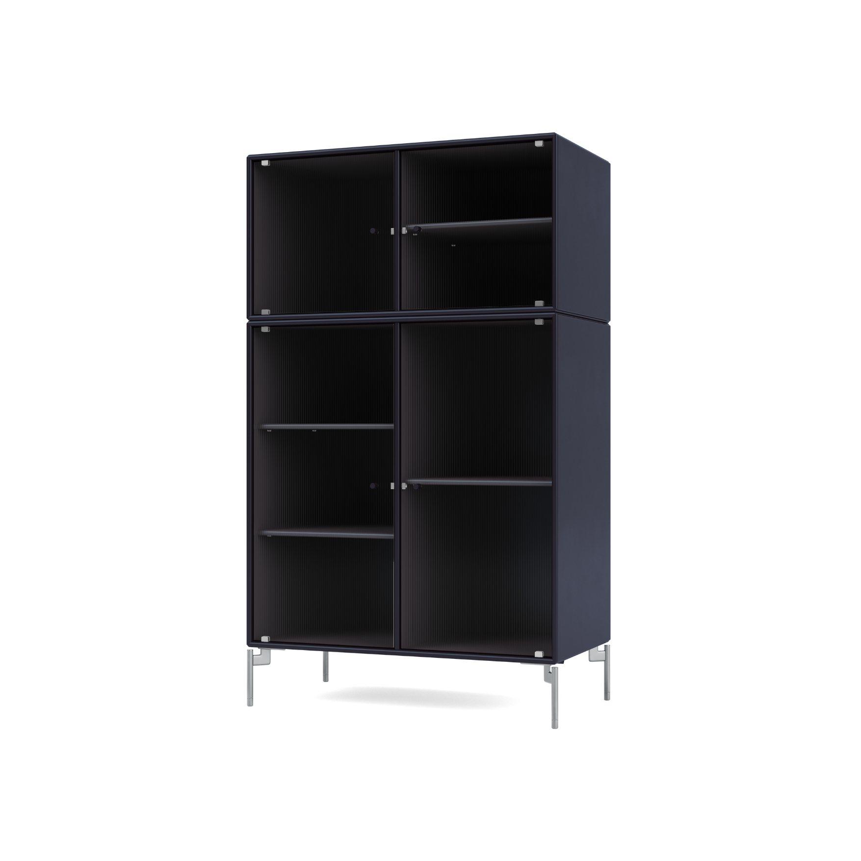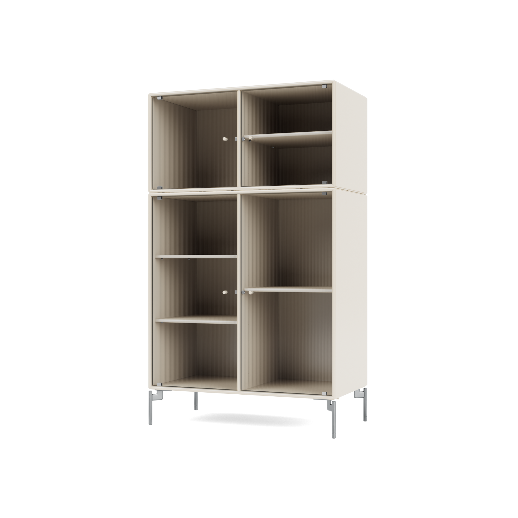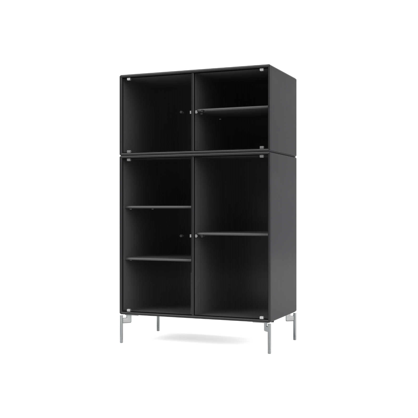 RIPPLE III is a medium-sized vitrine with 4 doors in rippled glass. The cabinet can be used as a highboard in the living room or for displaying tableware in the kitchen or dining area. The top of the cabinet is an ideal display surface for lamps, vases, and other decorative items.