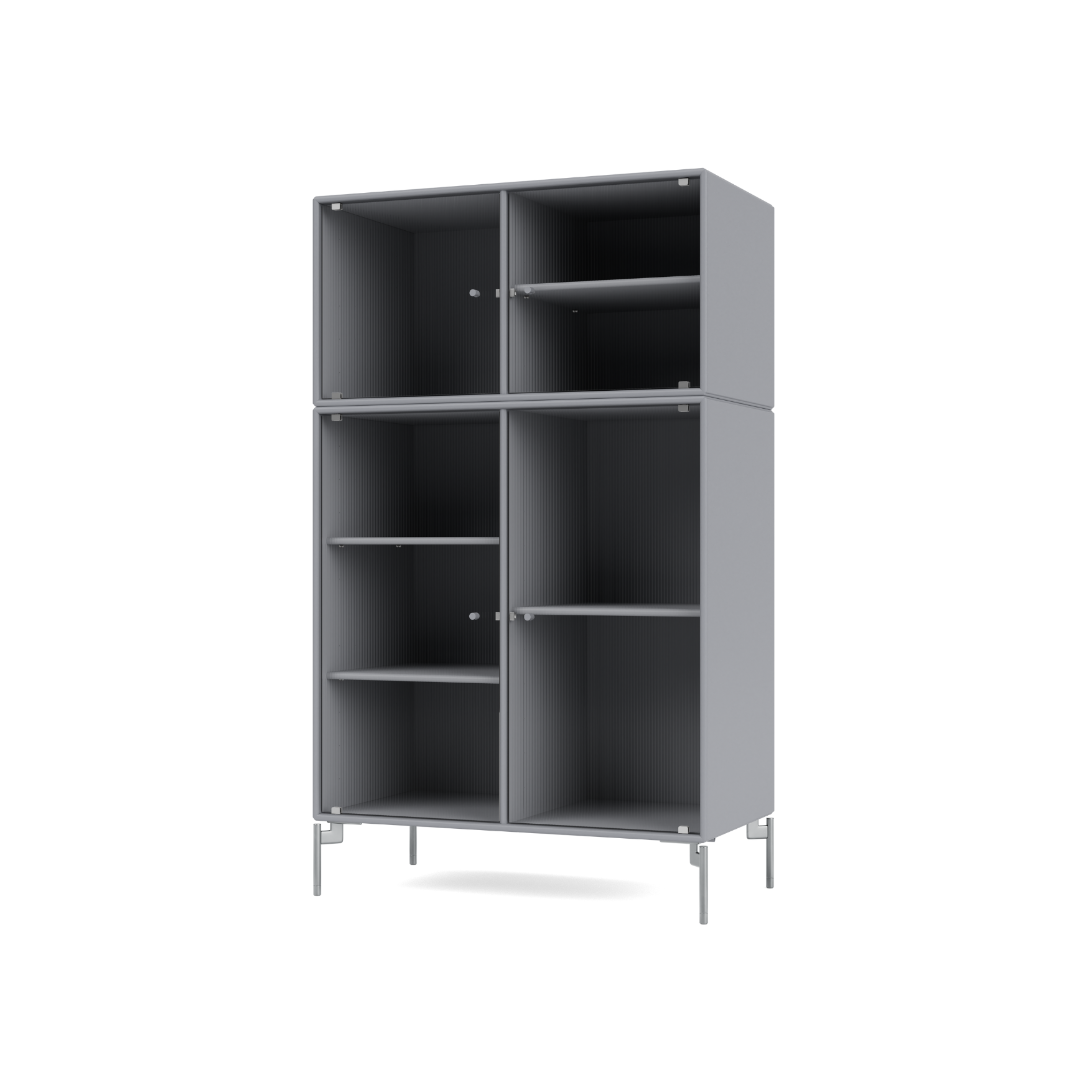 The cabinet has 4 movable shelves with carriers that make it easy to arrange and rearrange the shelves as needed. RIPPLE III is available with legs, plinth, or suspension rails for mounting on a wall.