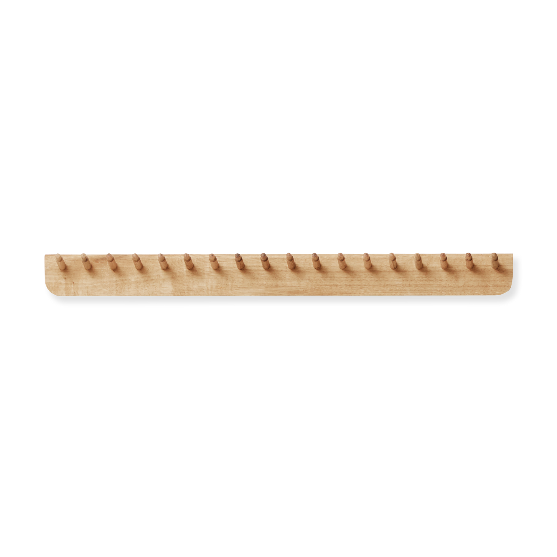 The beauty of the framework and the formation of the pegs creates a structured design constituted by recognizable repetitions. The pegs are carefully detailed and have a curved form with a robust foundation. The sturdy and strong backrest provides durability and means that the coat rack can take considerable weight.