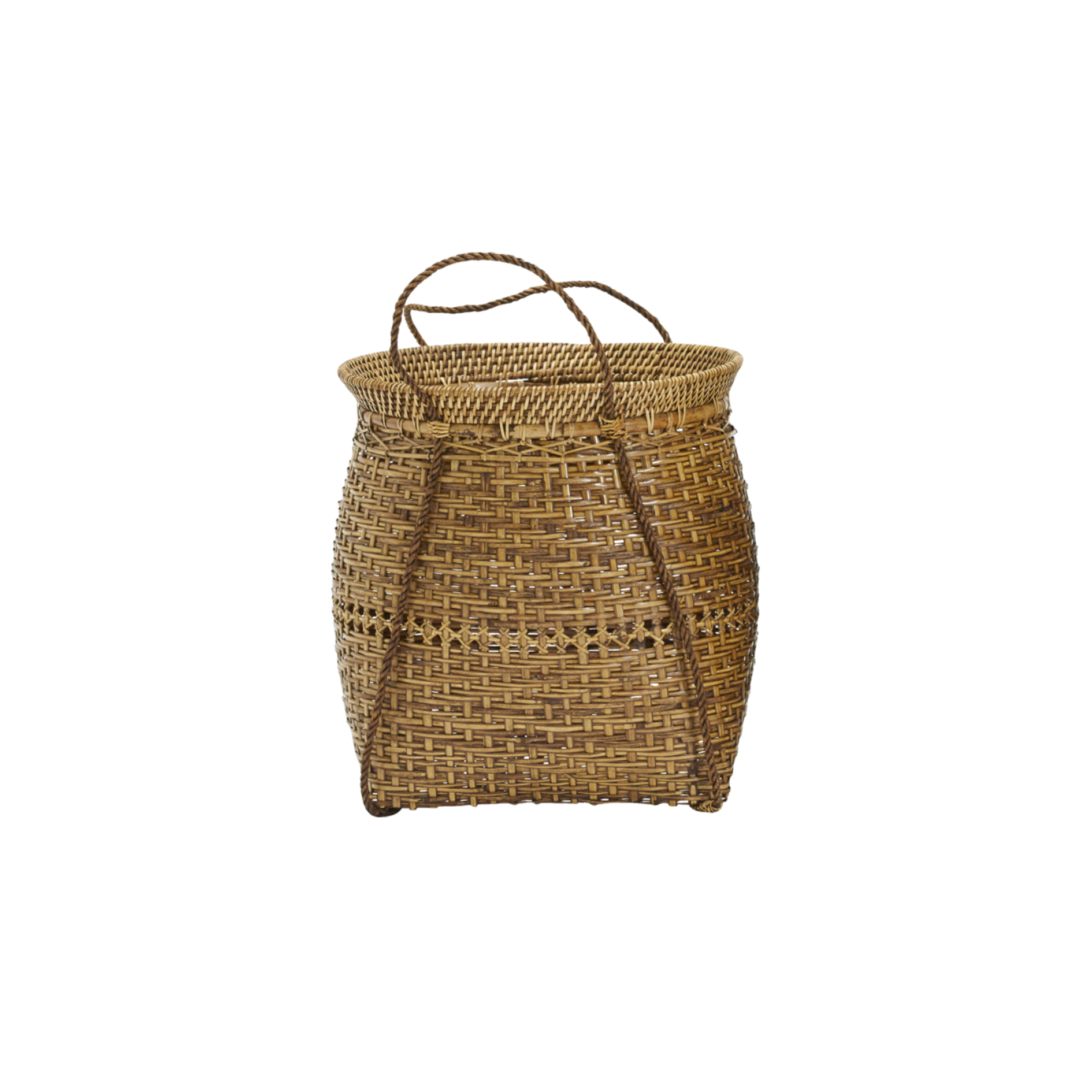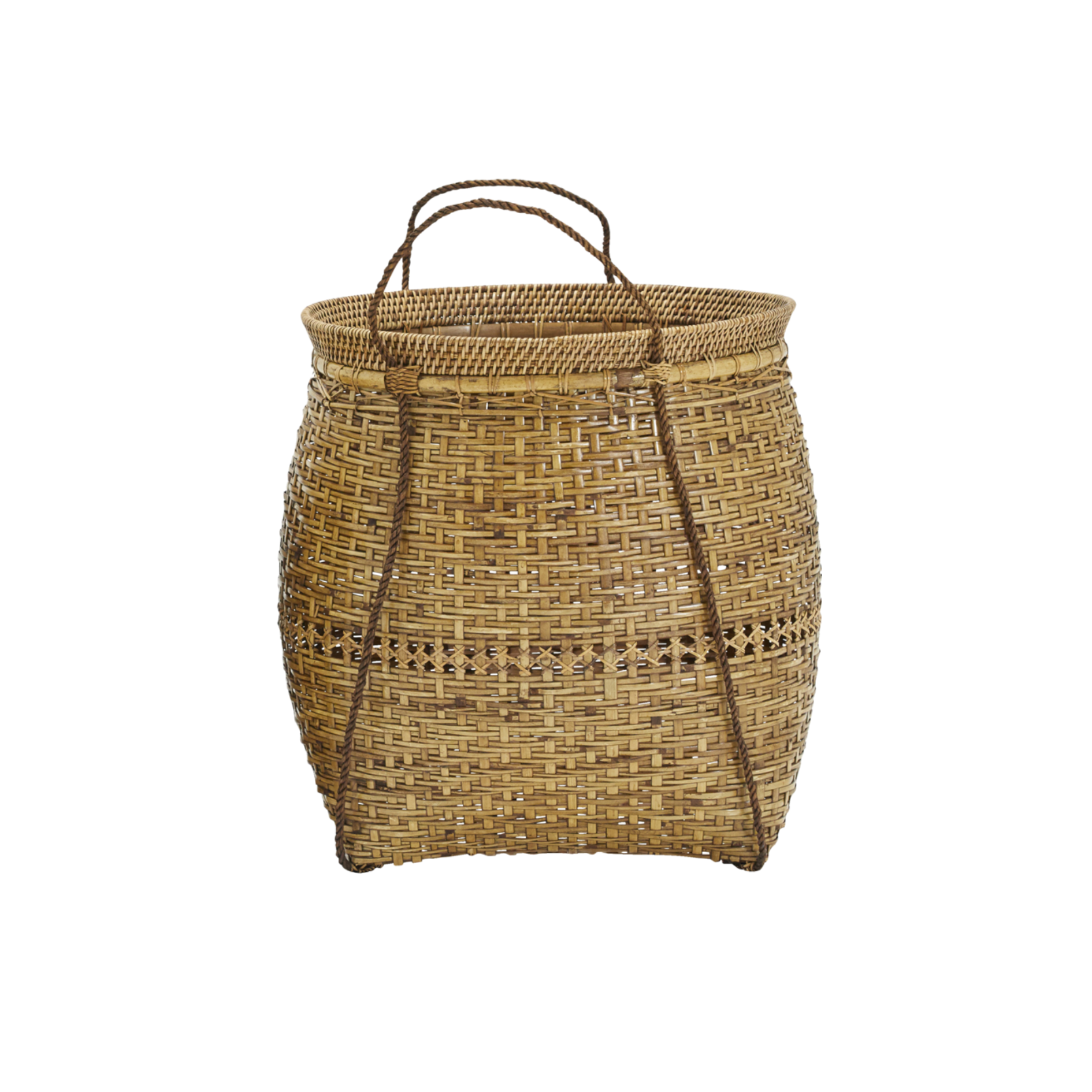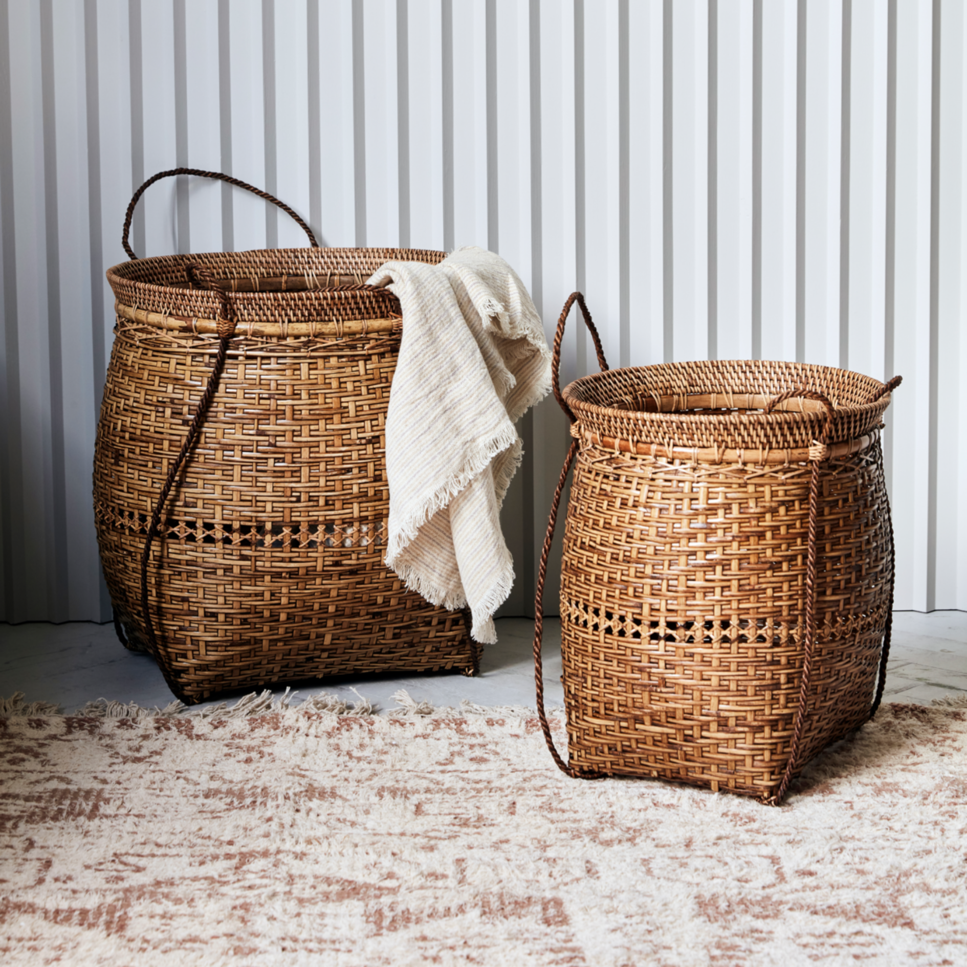 Kuta is a rattan and bamboo basket, available in two sizes. Their strength is the varying handwoven patterns with intricate detailing. As a nice contrast to their large sizes, the delicate handles start at the bottom and make it easy for you to move the baskets around.