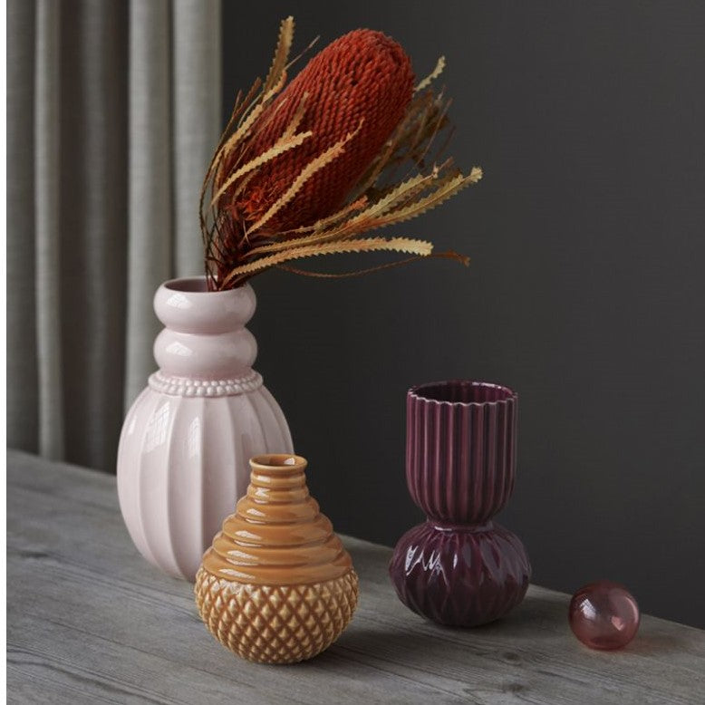 Pearlpuff vase in a delicate matte white glaze. With a 'personality' of its very own Pearlpuff gives recollection to a fine pearl necklace or a fashion runway pearl-studded dress. Some might even find it royal.